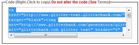 Volete un blog fashion & cool? I glitter fanno per voi. Per glitter, per chi non lo sapesse, si intendono immagini animate, in particolare in questo caso parlo delle scritte animate. Esistono un'infinità di siti web che permettono di realizzarle gratuitamente, e una scritta glitter, se fatta bene, fa una bella impressione in un blog, anche se è sempre consigliabile non esagerare, pena il lavaggio del cervello del visitatore di turno.