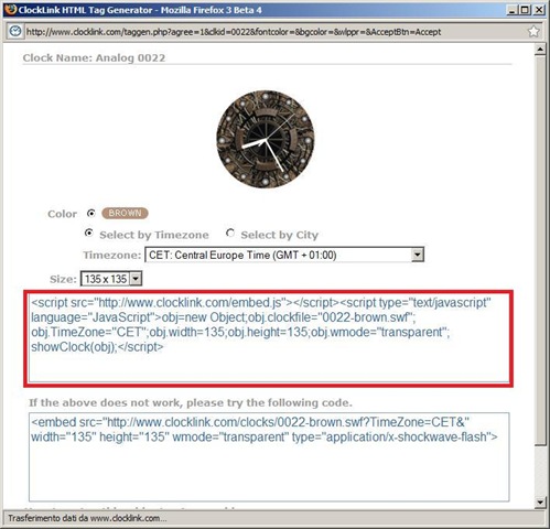 Nella parte evidenziata al centro, possiamo scegliere il tema del nostro orologio: analogico, digitale, animali, ecc... Una volta scelto l'orologio di nostro gusto, clicchiamo su View HTML Tag (anche questo evidenziato nell'immagine sopra) e dopo aver confermato le condizioni di utilizzo (ci compariranno solo la prima volta, cliccate su ACCEPT) vedremo apparire questa pagina:
